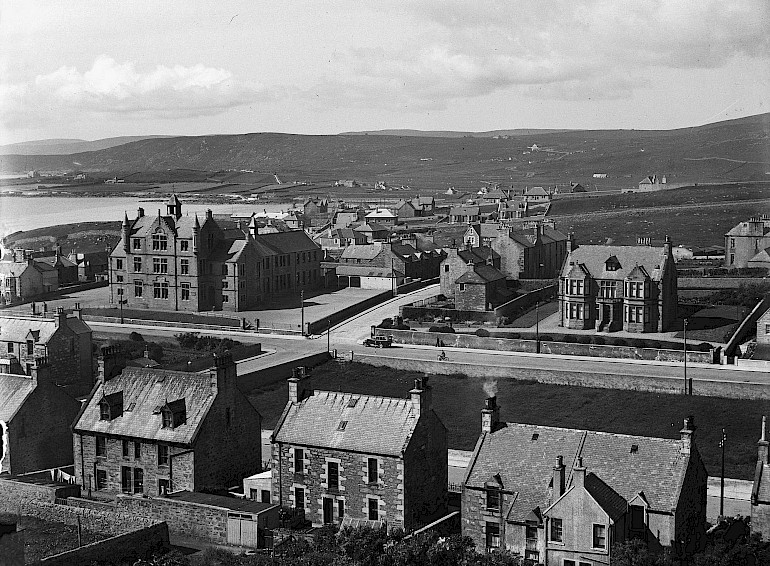 View of Market Street taken from the Town Hall, looking on to the prison yard, Market House and the Garrison. Photo © Shetland Museum & Archives Ref: NE08997