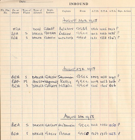 Passenger air services to Sumburgh Airport were well established by the time of the first log entry on 26 August 1958, although the aircraft landing, G-ANAP, a De Havilland Dove, was operated by the Civil Aviation Authority who then ran the airport. Two passenger planes followed, G-AGHM and G-AKJH, from British European Airways, a predecessor of British Airways. These were from the Douglas DC-3/C-47 family, although BEA had rebranded them as the Pionair by BEA. The name never really stuck and whoever was writing the log chose the wartime designation Dakota. A local dance band did adopt the BEA name, calling themselves The Pionaires.