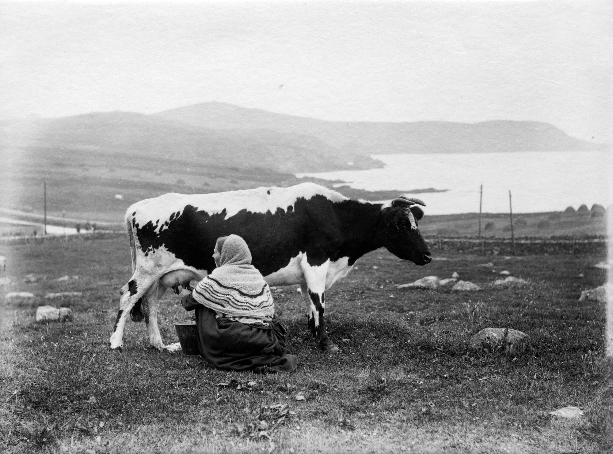 Above: Picture of an elderly woman milking a cow on the 'toun mals'. She is wearing a hap. Beyond herself and the cow is the junction of Burgh Road and Scalloway Road, with the Knab lying behind again and the Ward of Bressay in the far distance. Photographer C Reid (Ref: PR00033)